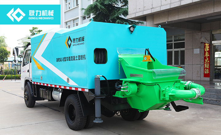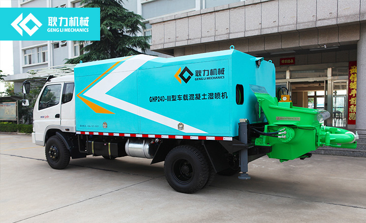 GHP24D-III 车载混凝土湿喷机底盘采用一般汽车底盘,零部件通用性强,具有配件供应及维修方便、施工转场方便等特点。关键零部件采用国内外知名品牌产品,电气系统拥有总线技术、基于嵌入式系统的工程机械控制器为核心、是实现机电液一体化控制的一种实时、有效、灵活的新型控制系统,全面负责对电动机、液压泵、液压控制阀和整机的复合控制,实时对电动机、液压系统、工作状态进行检测和保护,从而保证了整机的可靠性。该设备结构优良、牢固,抗冲击能力强;喷射平稳、连续性好、脉冲小,采用人工抱喷头进行喷浆作业,以此来缓解业内复杂机械臂喷浆手紧缺的现象;同时采用多喷头同时作业,施工效率高,同时可兼顾多个掌子面等诸多优点,充分体现了耿力公司“让施工更轻松”的企业宗旨。